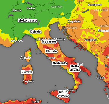 Al nord rischio debole o molto basso. Al centro rischio elevato su Sardegna e zone interne di Lazio e Toscana, moderato altrove. Al sud rischio molto elevato su Sicilia, Lucania, Puglia e Calabria Ionica.