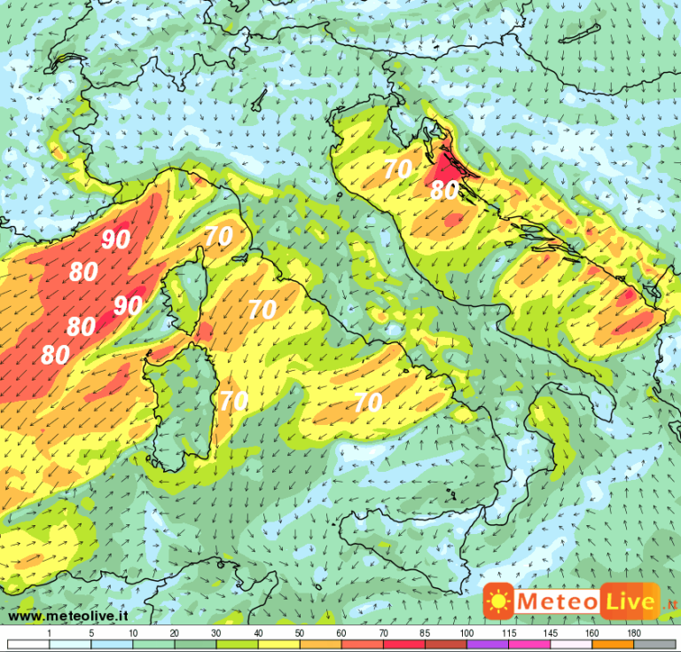 La mappa che vi proponiamo è valida per le ore 7 di sabato mattina. Notate come i venti tenderanno a disporsi quasi ovunque da nord-est presentando punte considerevoli (80-90 km/h) ad ovest della Corsica e della Sardegna. 70 km/h verranno raggiunti sui crinali appenninici, sul versante tirrenico e adriatico, dove al largo la forza del vento sarà ancora maggiore.