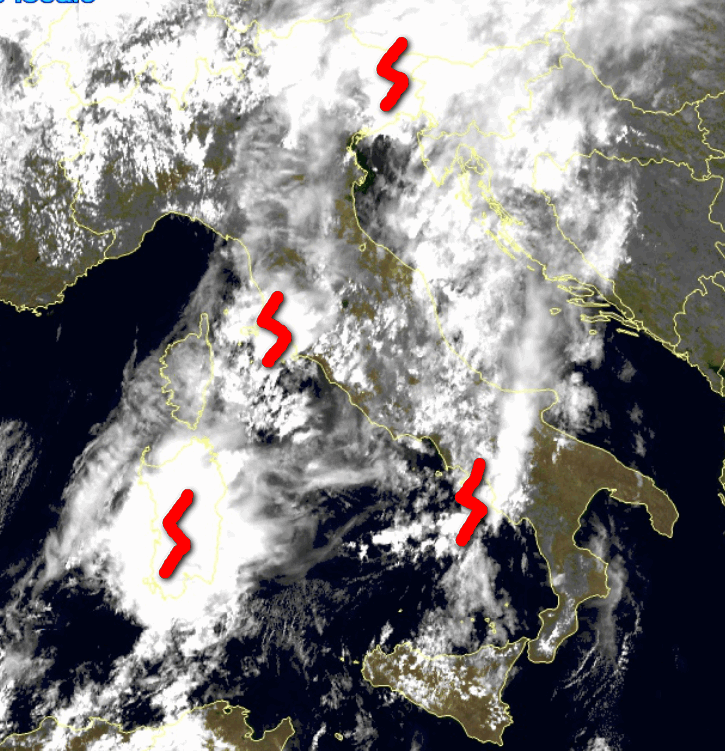 Sono diversi gli ammassi temporaleschi sulla nostra Penisola: sulla Sardegna, la bassa Toscana, il Friuli e sul Cilento. Rovesci sono in atto tra alto Veneto ed alta Lombardia. Il tempo migliore li troviamo sulla Liguria, sulla Puglia ed il settore ionico.