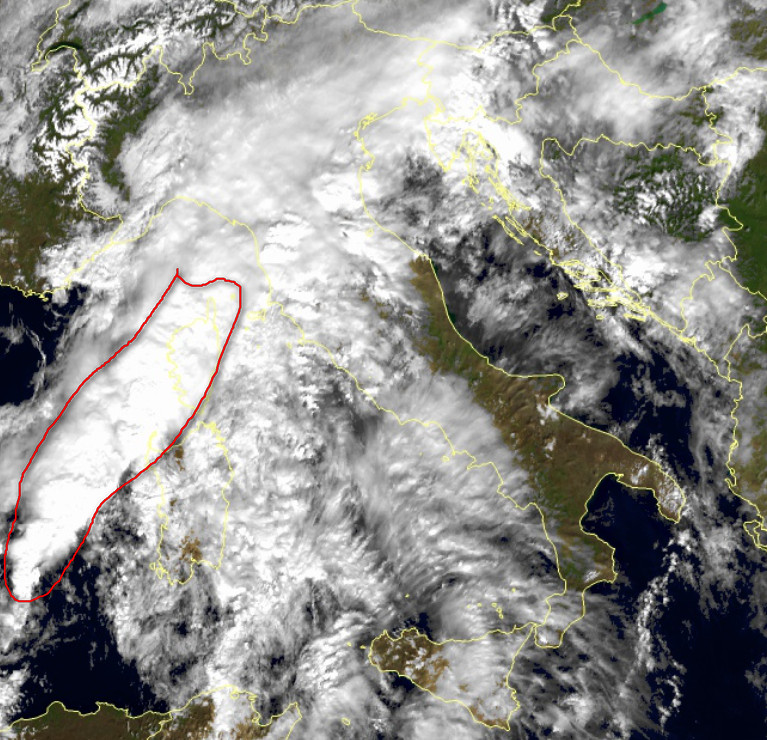 Quasi tutto il nord ed il Tirreno sono sotto mantelli nuvolosi anche spessi. Si salvano solo le regioni del medio-basso Adriatico, alcune aree del sud e l’estremo nord-ovest. Nell’area cerchiata in rosso sono presenti intensi temporali.