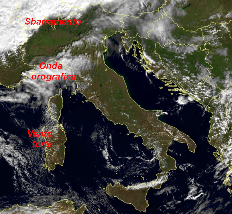 Diverse cose da segnalare: lo sbarramento impetuoso delle nubi da parte delle Alpi (si può dire che a sud dell’arco alpino non passi nulla). C’è poi un onda orografica tra la Liguria e l’Emilia Romagna dettata da nubi alte e sottili. Vento molto forte da nord-ovest agisce sulla Sardegna con raffiche davvero potenti. Infine, segnaliamo anche qualche rovescio tra il nord della Sicilia e il sud della Calabria, altrove situazione tranquilla.