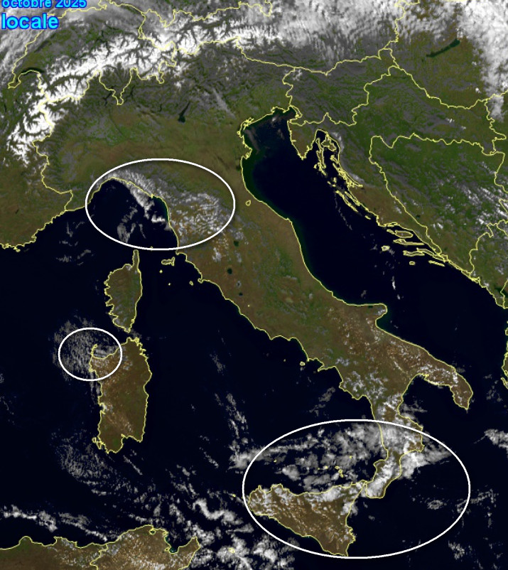 Il sole campeggia quasi ovunque tranne la Calabria e la Sicilia settentrionale dove è presente anche qualche rovescio. Residue correnti da nord-ovest interessano la Sardegna nord occidentale con nubi basse. Nubi basse anche tra la Liguria e la Toscana, qui per un flusso umido dal mare.
