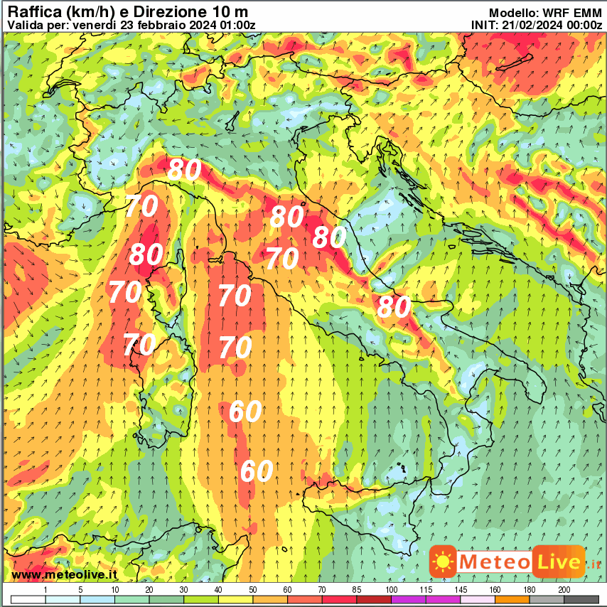 La perturbazione in transito sull’Italia nella giornata di venerdì 23 febbraio richiamerà venti molto forti meridionali sull’Italia. Ecco la mappa eolica valida per le prime ore della giornata in questione: