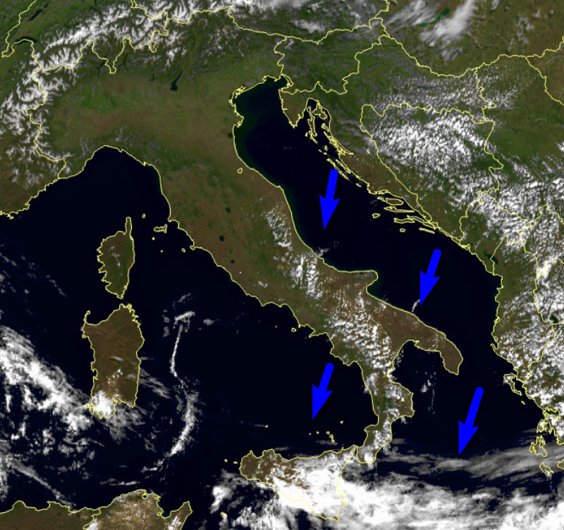 Al momento sono presenti rovesci solo sulla Sicilia meridionale. Le regioni del sud sono comunque interessate da una ventilazione abbastanza sostenuta settentrionale con addensamenti nelle aree interne. Qualche nube residua agisce anche nel sud della Sardegna, per il resto gran sereno.