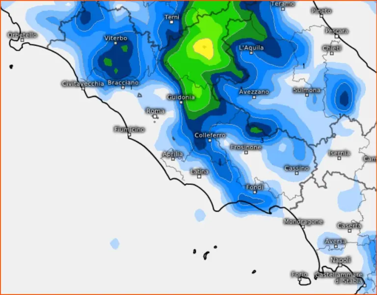 Il prestigioso modello ECMWF nell’ultimo aggiornamento uscito stamattina indica la possibilità di nevicate a quote basse su diverse zone dell’Italia, ma spicca la possibilità anche nei dintorni di Roma. Nella mappa sopra vengono indicate le nevicate previste per la giornata dell’8 gennaio 2023: si tratterebbe di una spruzzata bagnata che potrebbe spingersi anche di poco al di sotto dei 400m ma che in Appennino sopra ai 700-800m potrebbe risultare superiore a 10-15cm.