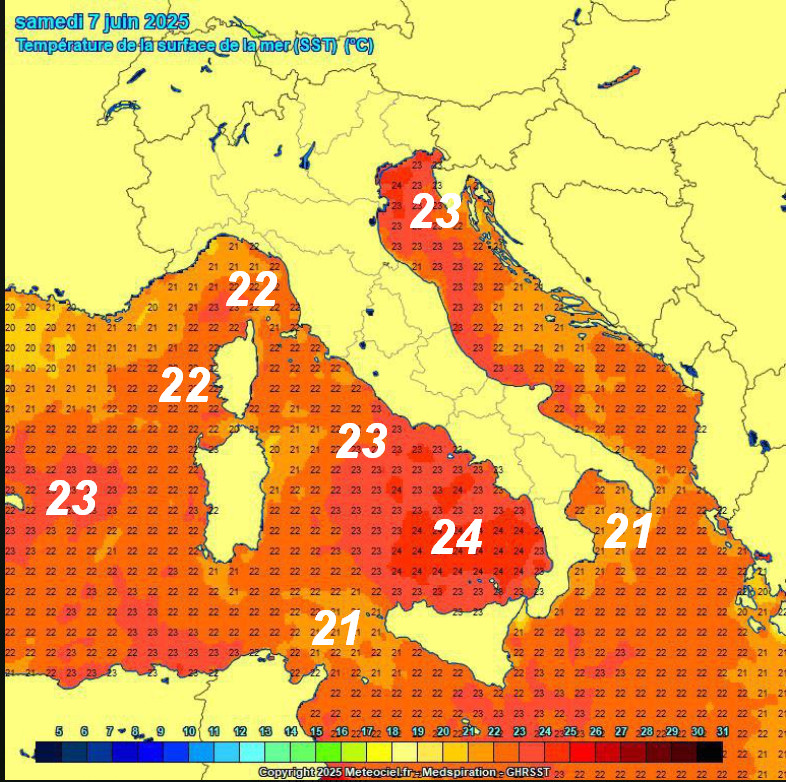 Queste invece sono le temperature del mare registrate il sabato 7 giugno del 2025: