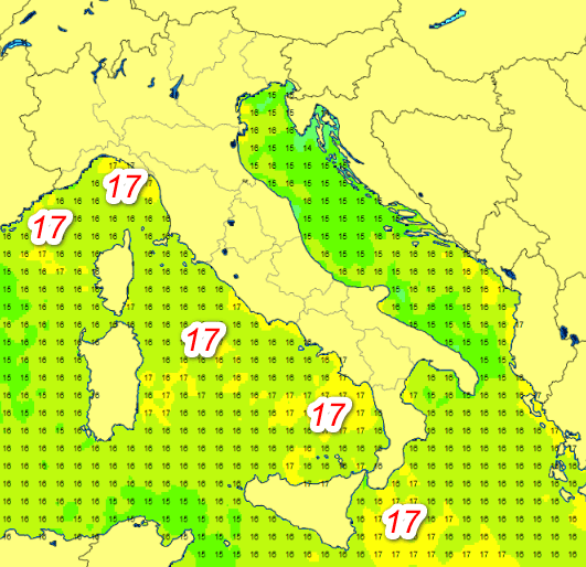 Punte di 17° sono presenti sul Mar Ligure, il medio-basso Tirreno ed alcuni settori dello Ionio. Altrove siamo tra i 15 ed i 16°.