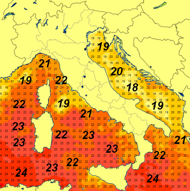 Osservate il versante adriatico, colpito da venti intensi da nord per più giorni! Le temperature degli specchi di mare corrispondenti sono scese anche sotto i 20°. Più calde le superfici marine a ponente con punte di 24° sul Canale di Sardegna.