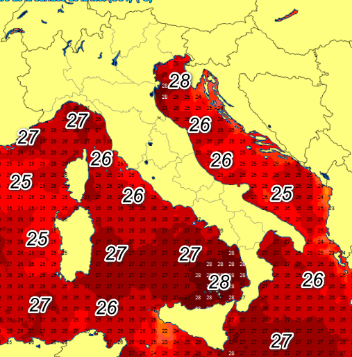 Le temperature superficiali sono comprese tra 25 e 28°, ma tenderanno ad aumentare ancora nei prossimi giorni.