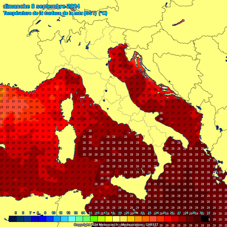 Le temperature di superficie sono comprese tra i 25° del Mare di Corsica e di Sardegna ed i 29° del basso Ionio.