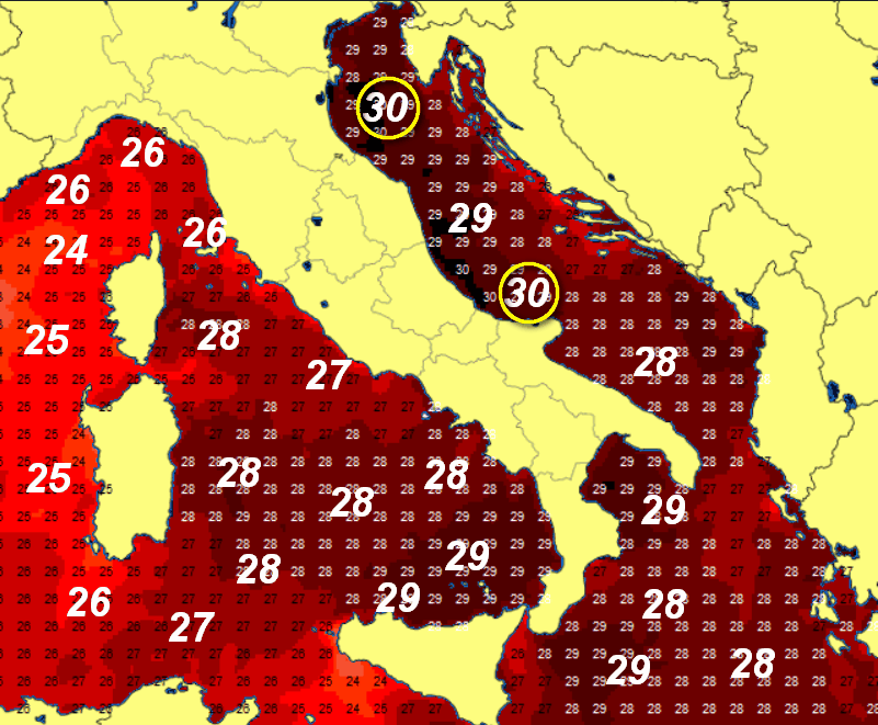 Punte di 30° sono presenti su alcuni settori del medio e alto Adriatico, ma 28-29° sono stati raggiunti anche sul basso Tirreno e lo Ionio.