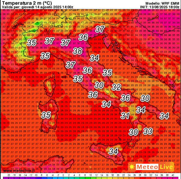 Situazione ancora critica al nord e su parte delle regioni centrali con 36-38° diffusi. Un pochino meglio al sud (specie sul basso Adriatico) e sulle Isole.
