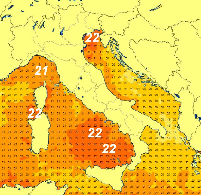 L’avvento dell’alta pressione africana sul Mediterraneo sta scaldando i bacini marittimi italiani. Punte di 22° si raggiungono sul basso Tirreno, sul golfo di Trieste e tra Corsica e Sardegna.