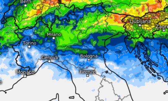 Però la mappa tratta dal modello ICON su base grafica Meteologix evidenzia un rischio maggiore tra est Lombardia e Triveneto, inferiore sul Piemonte e sull’Emilia-Romagna (almeno in questa prima fase), quasi nullo per la Liguria e la Valle d’Aosta:
