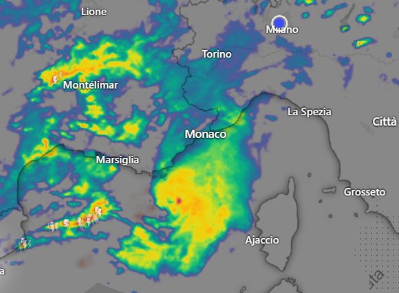 Per ora i fenomeni più rilevanti relativi al fronte in ingresso si sono mantenuti in mare aperto al largo della Costa Azzurra, è comunque probabile un coinvolgimento almeno parziale anche della costa francese e monegasca e poi anche di quella ligure e in genere della Valpadana entro sera, qui la situazione radar attuale: