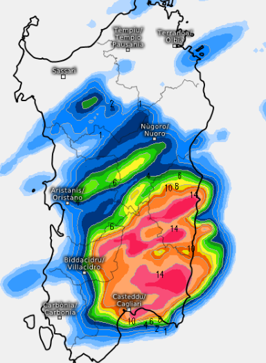 I fenomeni traslerebbero velocemente dall’Oristanese, Iglesiente e Campidano verso il Cagliaritano, Gerrei ed Ogliastra, determinando anche accumuli di pioggia consistenti, tra i 10 e 25mm, sfiorata anche la Barbagia, molto meno o quasi per nulla (secondo questo modello) il nord dell’isola.