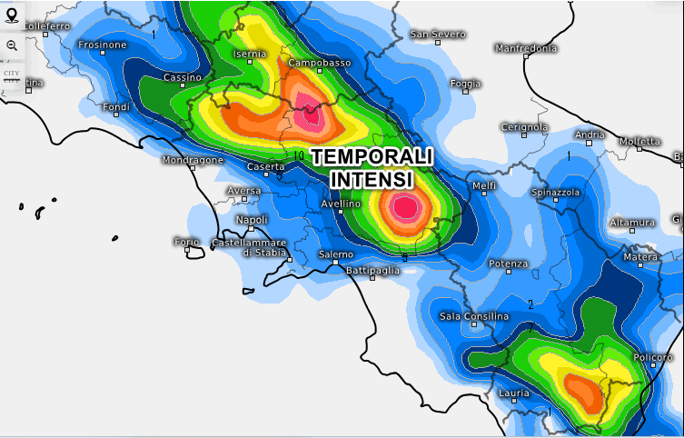 Si prevedono temporali pomeridiani intensi nelle aree interne di Campania, Molise e sulla Lucania.