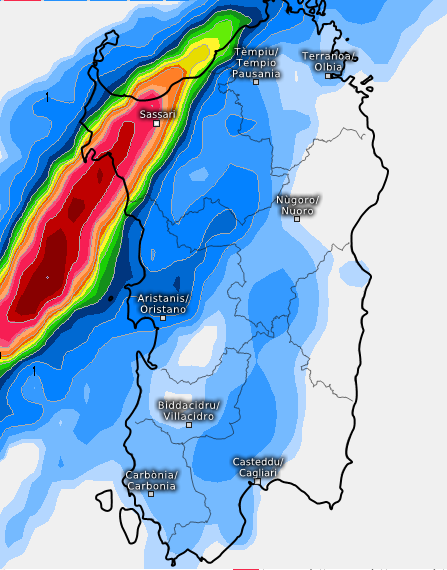Questa volta l’isola potrebbe farcela a ricevere accumuli di pioggia anche rilevanti, sia pure come sempre non distribuiti in modo democratico, cioè estesi a tutto il territorio e tantomeno non di quelli placidi e moderati, ma frutto di attività temporalesca e dunque piuttosto violenti, cioè in grado di scaricare in pochi minuti, ingenti quantità di pioggia. E’ comunque tutta acqua provvidenziale, dopo tanta siccità, tipica dell’estate in Sardegna, ma che stavolta si è protratta fin dalla primavera scorsa: