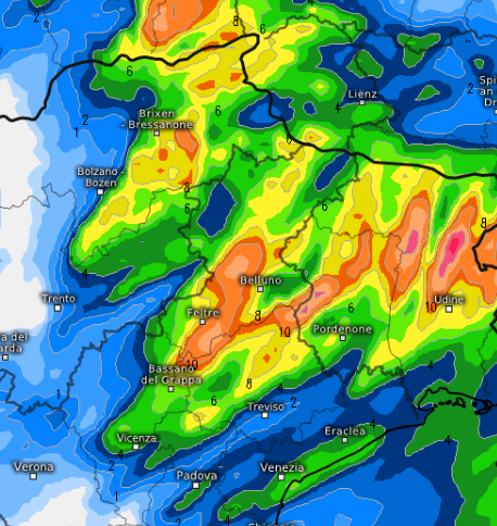Un minimo depressionario al suolo andrà scavandosi nelle prossime ore sul Golfo di Venezia, esaltando la fenomenologia prevista su tutto il Triveneto tra le 17 e le 23. I fenomeni colpiranno con particolare intensità e con presenza di fulminazioni la zona compresa tra Bassano del Grappa, Feltre e Belluno, ma anche l’alto Pordenonese (zona del Piancavallo) e poi l’Udinese, fin su tra Carnia e Tarvisiano: