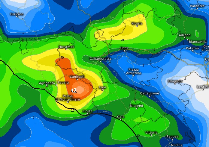 Zone interne tra Mussomeli e Canicattì: Nel corso della giornata, l’instabilità si estenderà verso l’interno dell’isola, colpendo in particolare queste località, come si vede dall’immagine: