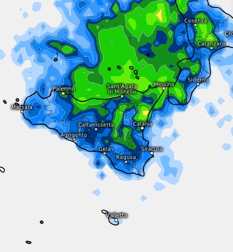 Nord della Sicilia e mare aperto vicino alle Eolie: I primi temporali si svilupperanno in queste aree, con fenomeni anche intensi in mare aperto e tra Messina e Sant’Agata di Militello, come mostra l’immagine: