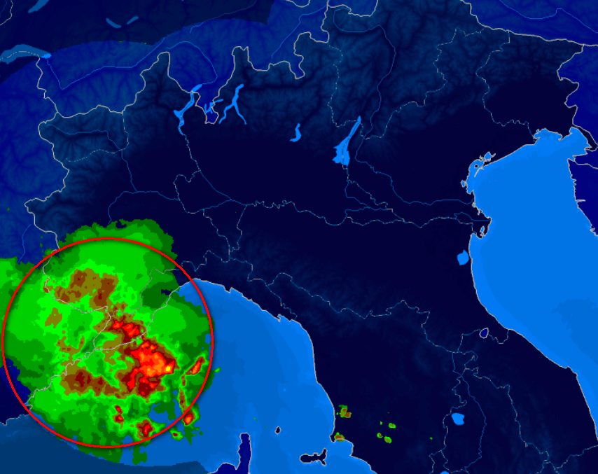 L’animazione del radar mostra la cella temporalesca puntare verso Savonese e Genovesato, anche se al momento non è dato di capire se muovendosi verso levante perderà o meno forza. Lo vediamo molto bene qui: