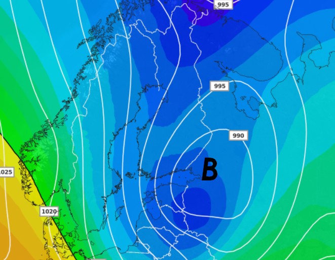 Da notare invece il sottovento e dunque l’ombra pluviometrica attesa su gran parte della Svezia.