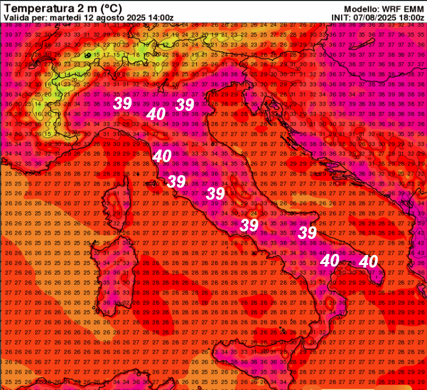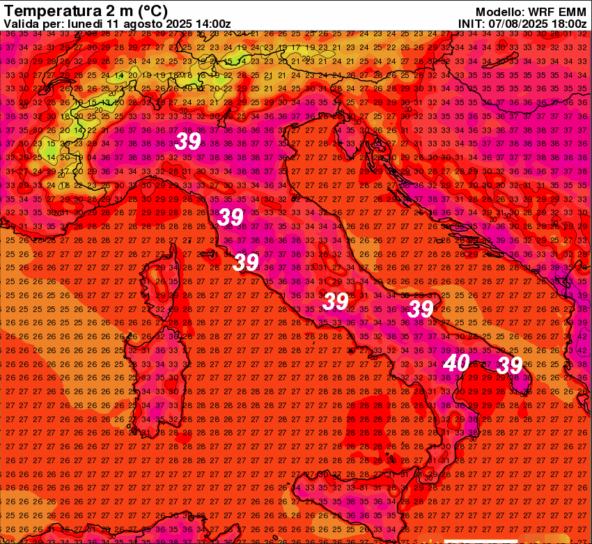 40° sulla Pianura Emiliana, la Toscana, la Lucania e il Salento; 39° su Pianura Lombarda ed Emiliana, zone interne del Lazio e sul Foggiano. Attenzione al DISAGIO da CALDO che sarà molto intenso!