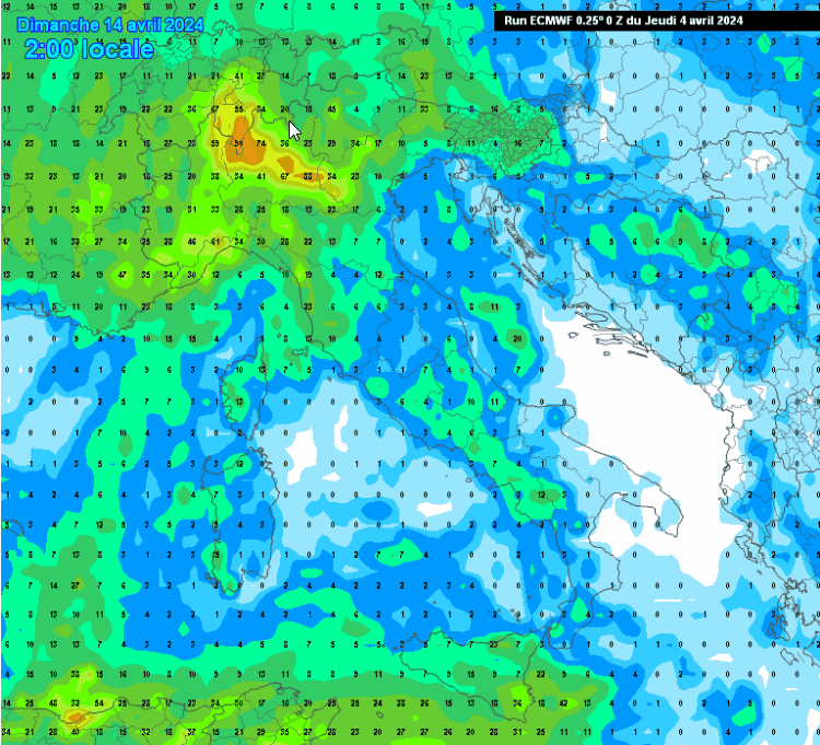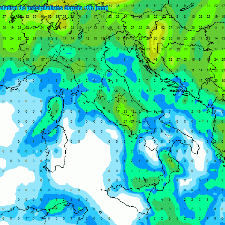 Le aree maggiormente coinvolte dalle piogge, secondo il modello di oltre oceano, saranno le aree alpine e prealpine con circa 50 mm di pioggia; una trentina di millimetri sono attesi anche nelle aree intere poste tra Abruzzo, Lazio e Campania, per il resto precipitazioni più scarse.