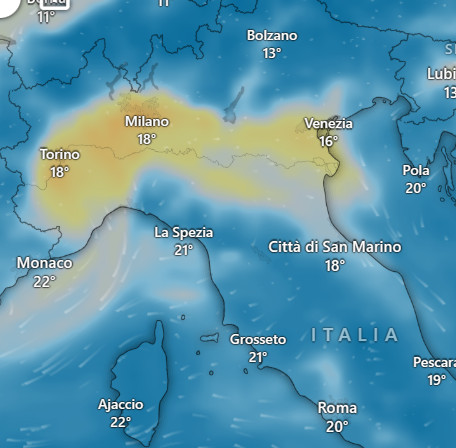 La stasi anticiclonica unita ad una lieve corrente nord-orientale ha fatto sforare i limiti di PM 2.5 (polveri sottilissime) ed a tratti anche del PM 10 (polveri sottili). Questa è la concentrazione attuale di PM 2.5 al settentrione: