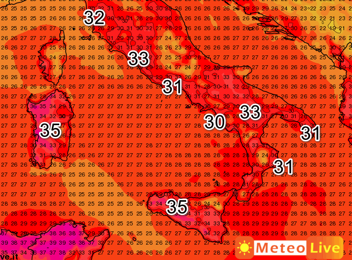 Punte di 35-36° saranno probabili sulle due Isole Maggiori. Sul resto del centro e del meridione valori superiori a 30° con punte di 32-33° in maniera abbastanza diffusa.