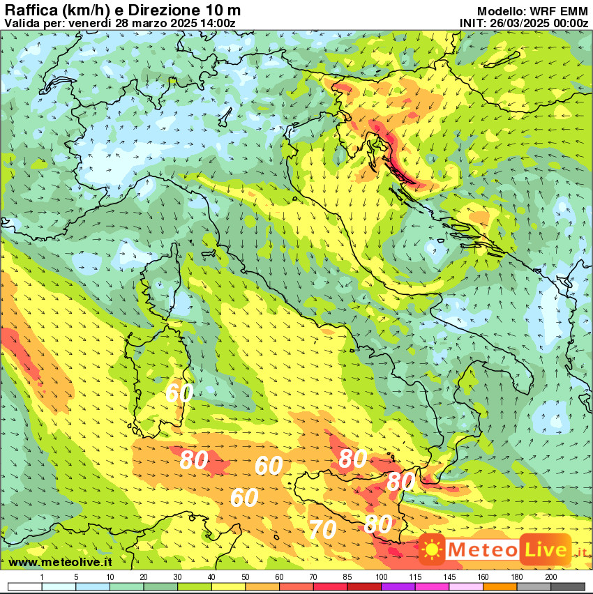 Queste invece sono le raffiche di vento previste in Italia alle ore 15 di venerdi 28 marzo:
