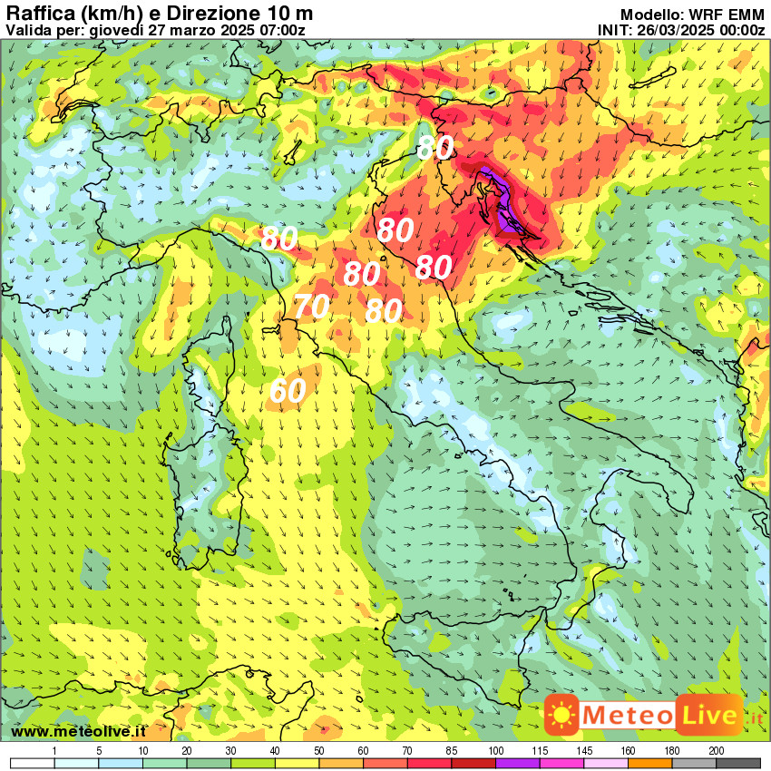 La prima cartina mostra le raffiche di vento previste in Italia nella mattinata di giovedi 27 marzo attorno alle ore 8 del mattino: