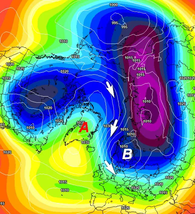 Il problema è che se l’anticiclone puntasse addirittura più ad ovest, cioè verso la Baia di Baffin, allora il flusso delle correnti gelide in arrivo dal Polo potrebbe scegliere le alte latitudini (con movimento a ritroso, cioè antizonale) favorendo nevicate e bufere di neve tra Regno Unito e nord Europa, al massimo sull’Europa centrale, ma non sul nostro Paese, dove persisterebbe una condizione autunnale.