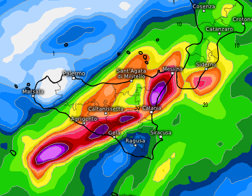 Uno sciame temporalesco molto intenso potrebbe attivarsi nella mattinata di domenica 19 sulla Sicilia, andando a determinare nubifragi tra Agrigento, Gela, Caltanissetta e Catania, fino a raggiungere Messina e Reggio Calabria: